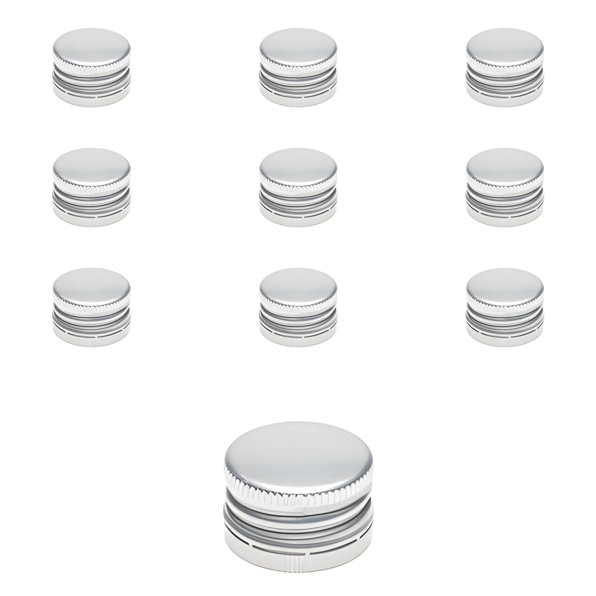 Der silberfarbene Schraubverschluss aus Aluminium im praktischen 10er-Pack hat einen Abrissring zur Originalitätssicherung und passt auf alle Schraubflaschen mit einer PP 28-Mündung, z. B. auf Geradhalsflaschen (ab 200 ml), die Pinta 350 ml und 500 ml SV, Taschenflaschen (ab 100 ml) und viele andere.