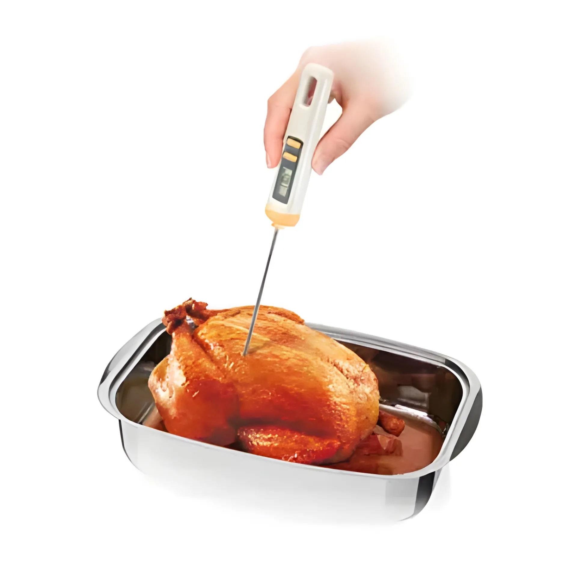 Das Küchenthermometer aus hochwertigem Edelstahl und Kunststoff ist mit einem LCD-Display und einer Schutzhülle für den Sensor ausgestattet. Es ermittelt schnell und genau die Temperatur in Desserts, Glasuren, Brühen sowie anderen Speisen, Fleisch, Getränke und Saucen in °C oder °F. Das Messgerät ist beständig gegen Dampf und Feuchtigkeit, ist aber nicht spülmaschinenfest. Es wird mit einer Knopfzelle (LR44) betrieben, die im Lieferumfang enthalten und bei Bedarf austauschbar ist.