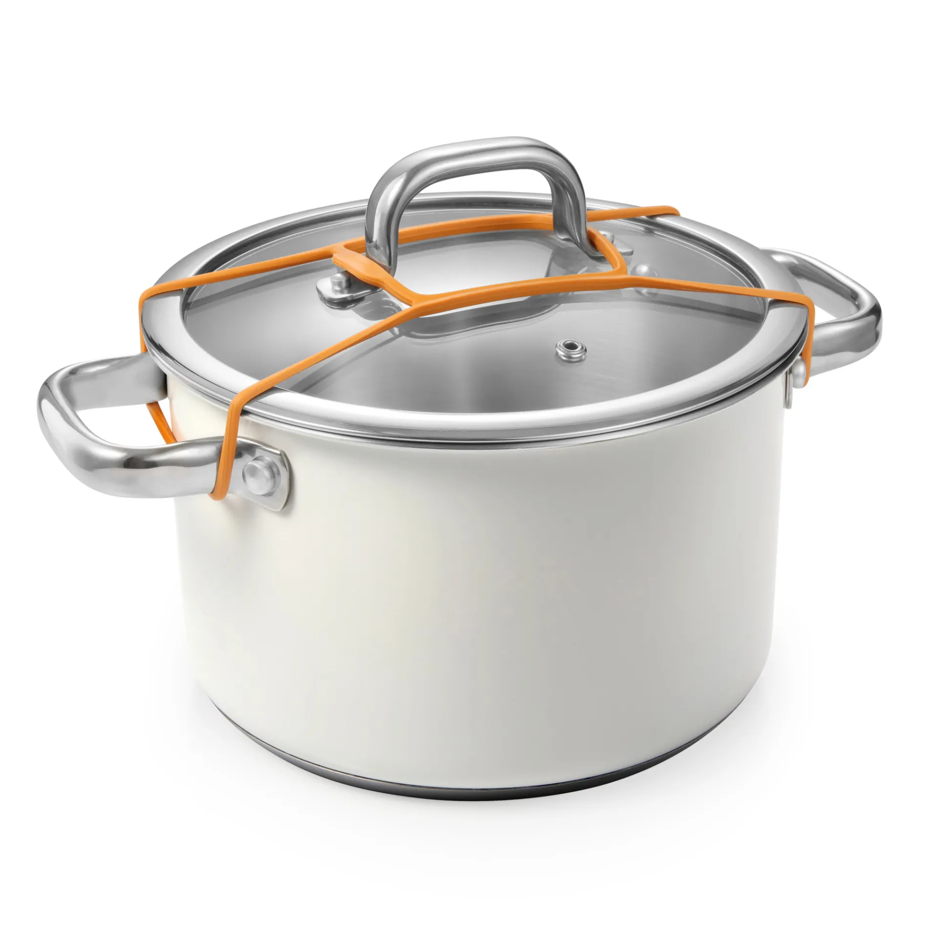 Das elastische Befestigungsband für Topfdeckel ist superpraktisch, wenn man volle Töpfe mit Suppe oder Eintopf auslaufsicher transportieren möchte. Der ovale Ring aus hochwertigem Silikon wird einfach über den Deckel gezogen und an beiden Enden an den seitlichen Topfgriffen befestigt. Dadurch wird der Deckel fest auf den Topf gepresst, kann nicht verrutschten, und nichts kann beim Transport herauskleckern.