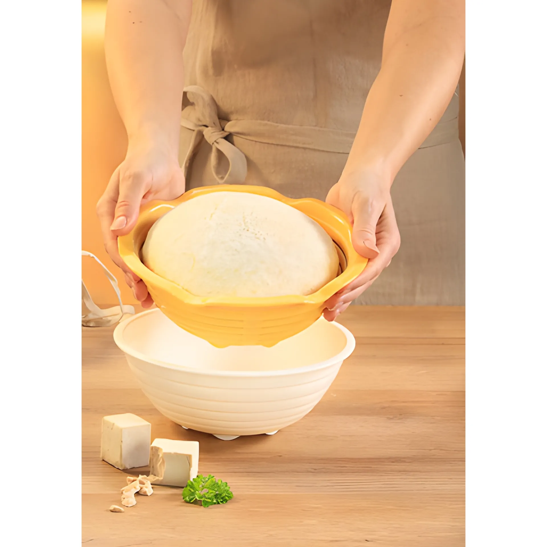 Das orangefarbene Gärkörbchen und die weiße Schale bestehen aus erstklassigem robusten Kunststoff und sind spülmaschinenfest.