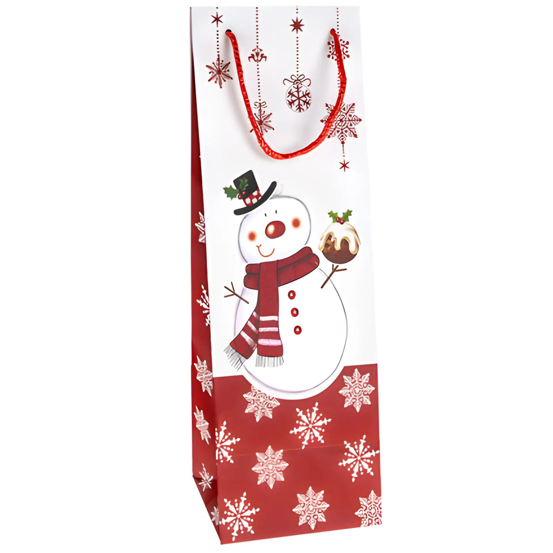 Winterliche Flaschentasche mit einem lustigen 3D Schneemann, der auf der Vorderseite eine rote Bommelnase hat. Die stabile Papier-Tragetasche ist in den Farben rot und weiß gehalten, mit Schneeflocken und Baumbehänge verziert und hat eine rote Tragekordel an der eine Karte zum Beschriften befestigt ist. Sie eignet sich perfekt für Geschenke und breitere Flaschen in der Weihnachtszeit, auch eine Whiskey-Karaffe findet in dieser Verpackung ausreichend Platz.