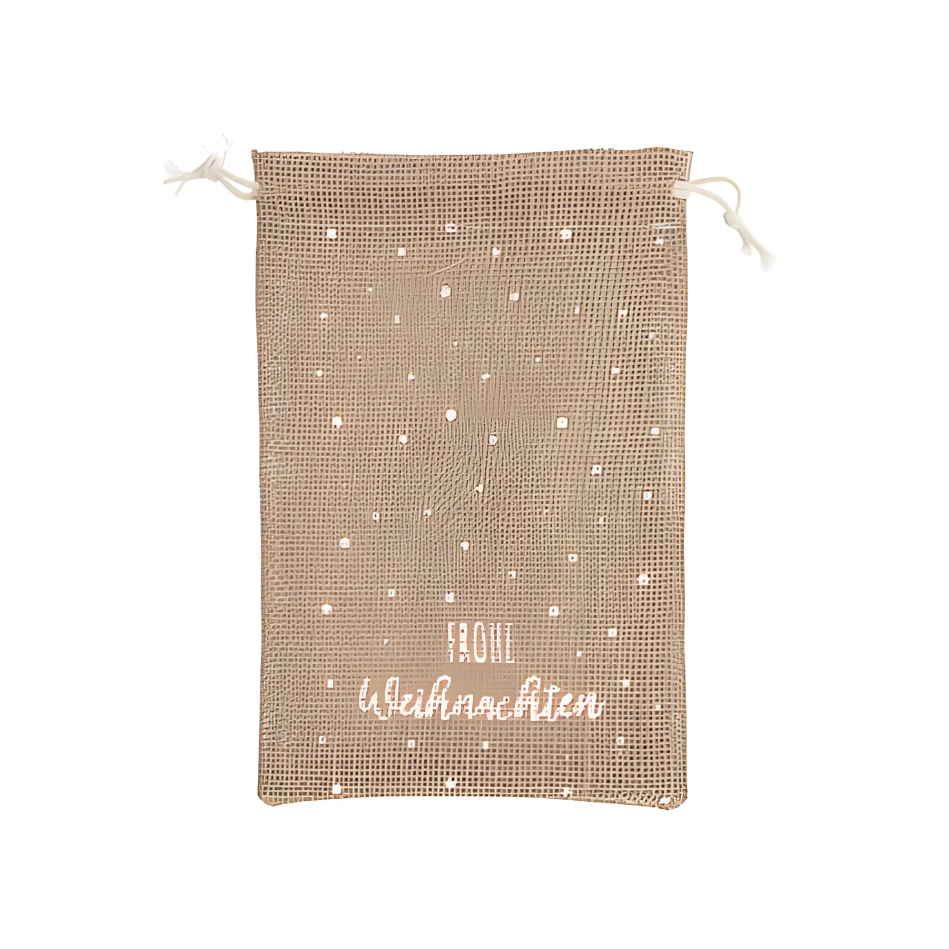 Weihnachtliches Jutesäckchen mit Zugband zum Verschenken. Der Jutebeutel mit aufgemalten weißen Sternen ist ideal für kleine Weihnachtsgeschenke, kleine Likörflaschen, selbstgemachte Marmelade und andere liebevoll ausgesuchte Kleinigkeiten zu Weihnachten. Den Geschenkbeutel gibt es in 2 Varianten, mit der Aufschrift ‚Frohes Fest‘ und ‚Frohe Weihnachten‘, die bei der Lieferung nicht auswählbar sind.