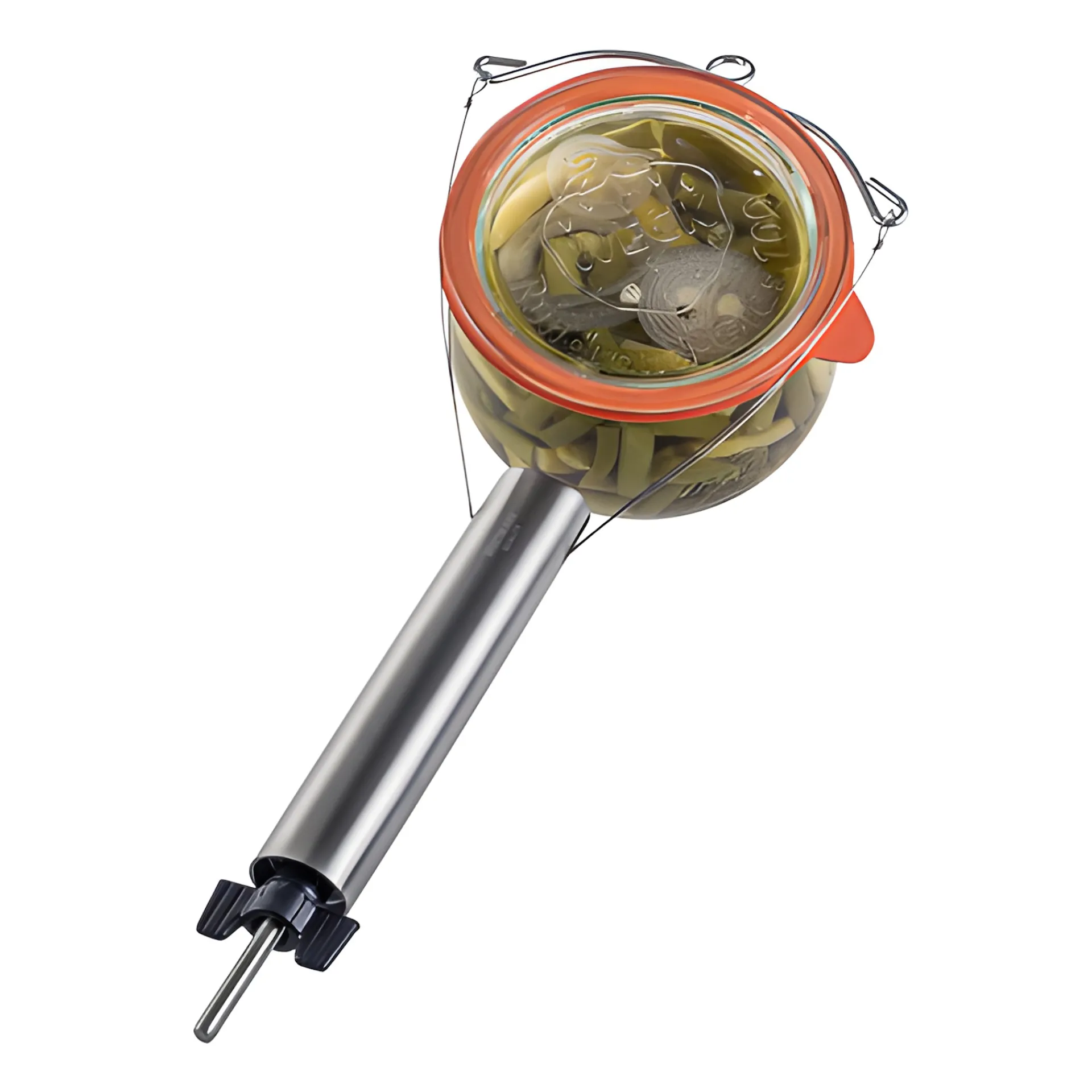 Glasöffner mit Drahtschlingen zum leichten Öffnen von WECK- und Einmachgläsern. Dieser Einkochglas-Öffner ist die perfekte Lösung, wenn der Dichtungsring wie festgeklebt ist, die Lasche abgerissen und der Deckel sich einfach nicht vom Einkochglas lösen lässt. Der handliche Edelstahl-Deckelöffner besteht aus einem kurzen Stab, an dessen Enden ein Drehgewinde mit Flügelmutter und zwei flexible Drahtschlingen angebracht sind. Die dicke Schlinge ist für Rillengläser geeignet, während der dünne Draht Rundrandgläser, wie z. B. Tulpengläser, öffnet.