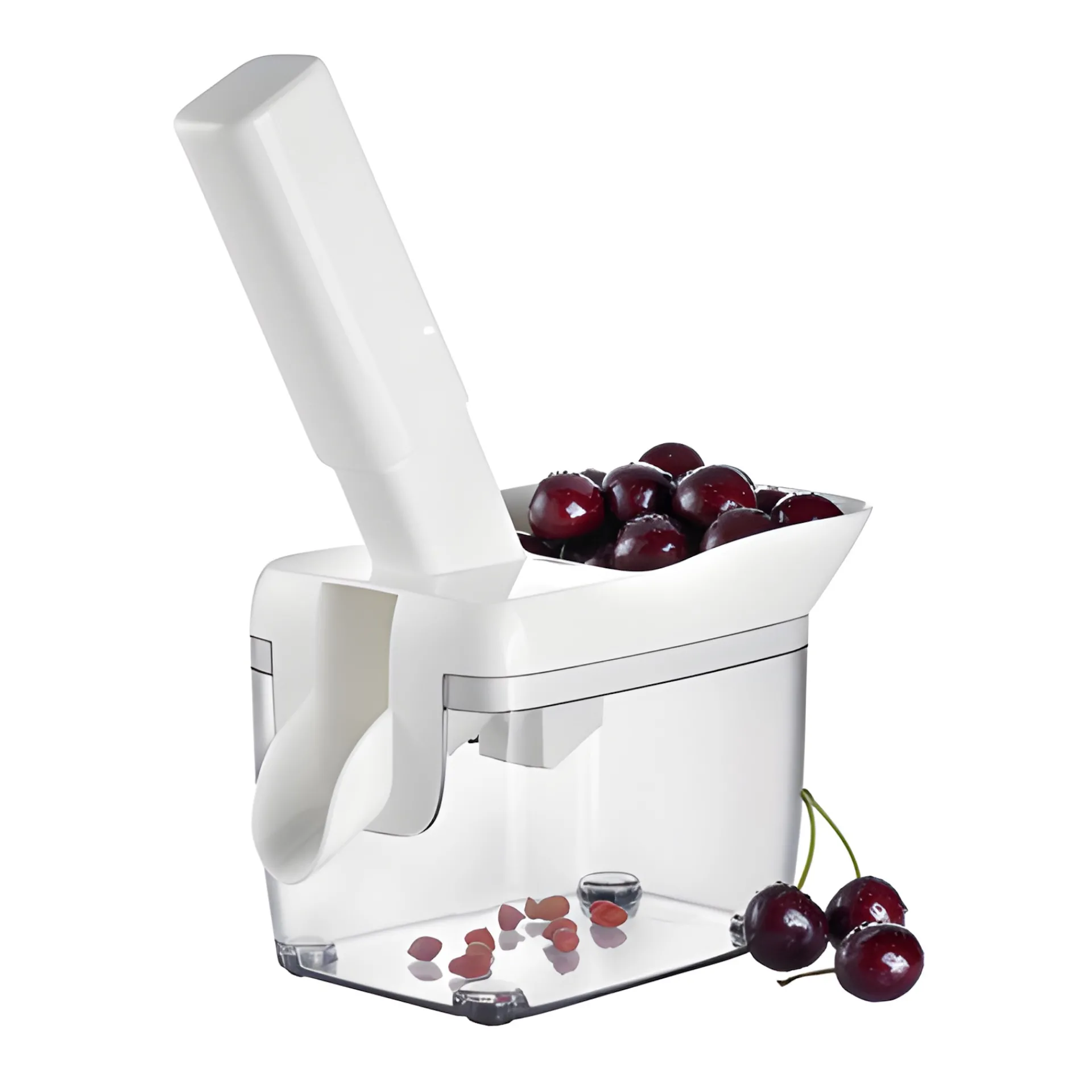Die optimal geneigte Schütte sorgt für schnelles Wiederbefüllen der Entkerneinheit und die große Kernkassette passen viele Kerne, sodaß lästiges Entleeren zwischendurch entfällt.