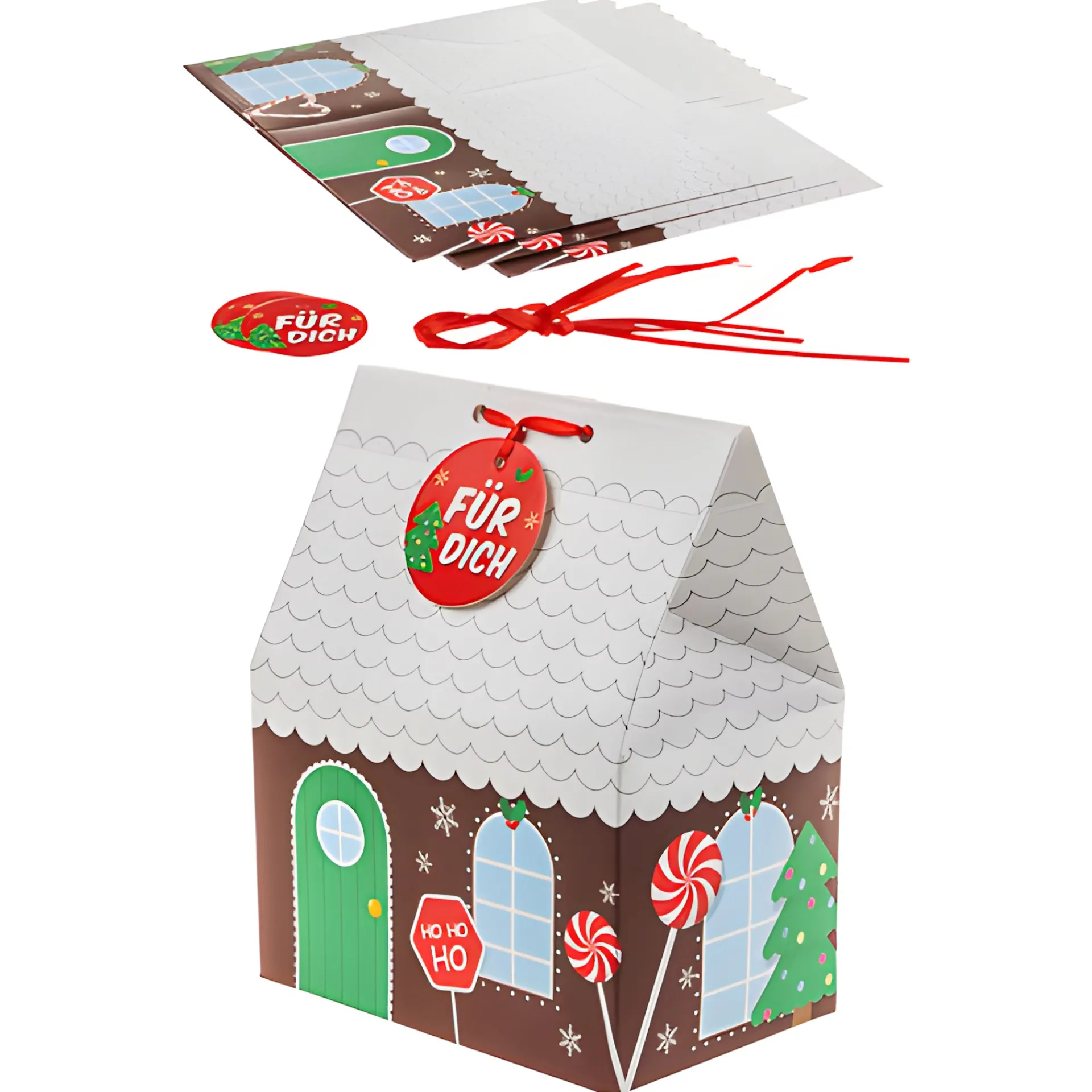 Weihnachtliche Lebkuchen-Geschenkschachteln für Pralinen und Weihnachtsplätzchen. Die kleinen Lebkuchenhäuser aus festem Papier sind ideal für selbstgemachtes Konfekt, Kekse, kleine Marmeladengläser und andere Aufmerksamkeiten zur Weihnachtszeit. Die Schachteln selbst lassen sich einfach zusammenbauen, befüllen und verschließen. An der braunen ‚Fassade‘ zwischen den Fenstern und der Tür sind bunte Zuckerstangen, geschmückte Weihnachtsbäume und Mistelzweige, die mit dem ’schneebedeckten‘ Dach einfach toll aussehen. Die runden Anhänger mit der Aufschrift ‚Für dich‘ sind gelocht und werden mit den roten Bändern so ganz leicht an den vorgestanzten Löchern am Dach befestigt.