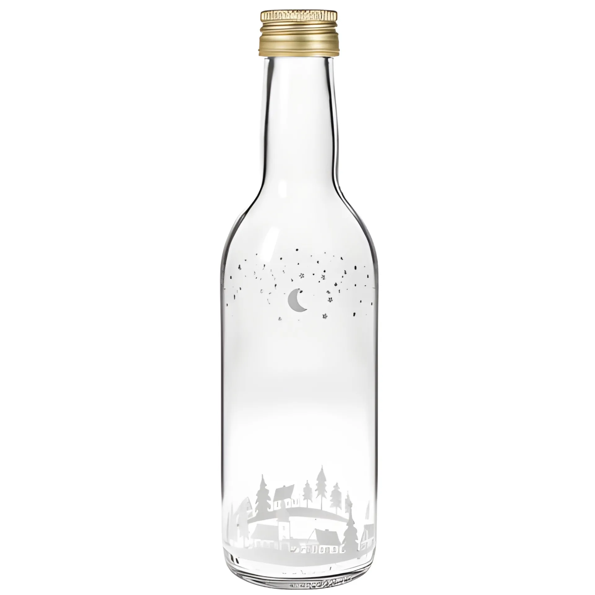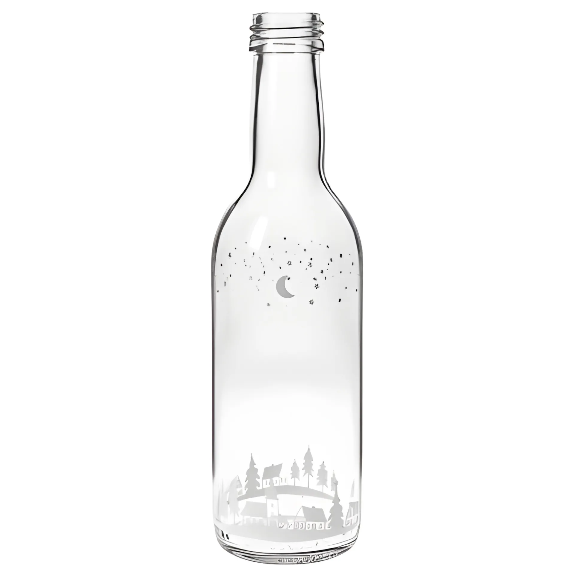 Hübsche Motivflasche mit weißem Winterdruck, der wunderschön zur Geltung kommt, wenn die Flasche befüllt ist. Mit weihnachtlichem Sirup oder winterlichem Likör befüllt ist diese Glasflasche ein ganz besonderes Präsent für die Adventszeit.