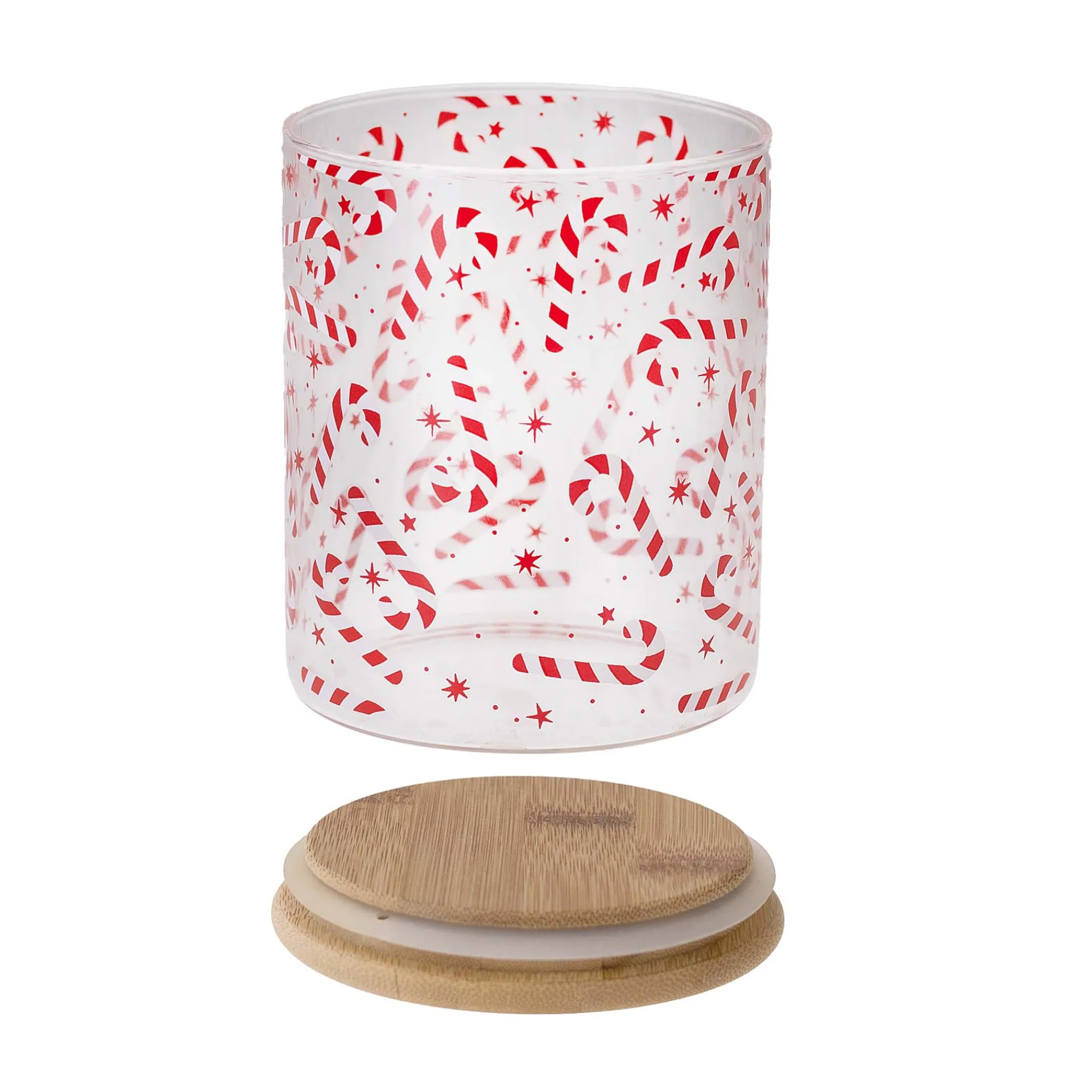 Das hübsche runde Glas mit dem schönen Holzdeckel ist ideal zum Aufbewahren oder Verschenken von selbstgebackenen Weihnachtsplätzchen, Pfefferkuchen und anderen weihnachtlichen Süßigkeiten. Rundherum ist es dekoriert mit vielen rot-weißen Zuckerstangen und kleinen Sternen, die genug Platz für einen Blick auf den leckeren Inhalt im Glas lassen.