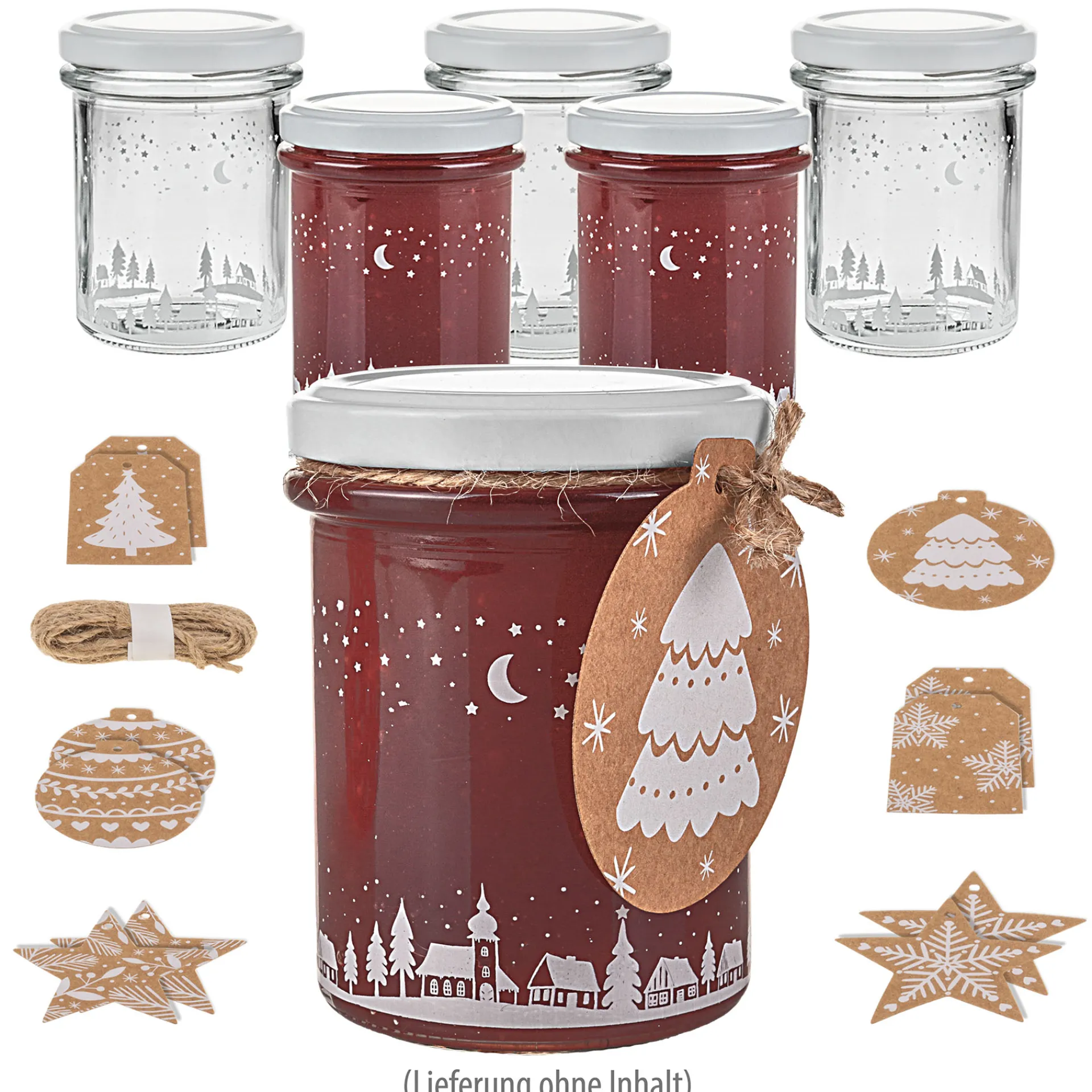 Weihnachtliches Gläserset mit einer schneebedeckten Winterlandschaft, in der selbstgemachte Marmelade perfekt präsentiert und verschenkt werden kann. Das winterliche Motivglas ist dezent mit Häusern zwischen Tannenbäumen bedruckt und hat zudem die perfekte Größe für leckeren Kuchen im Glas. Die in Weiß gehaltenen TO-Verschlüsse können super zum Einkochen verwendet werden, sodass dem Inhalt der hübschen Einmachgläser keine Grenzen gesetzt sind. Die weiß/braunen Anhängeetiketten mit Weihnachtsmustern runden das Marmeladenglas perfekt ab und bieten genügend Platz für ganz persönliche Weihnachtsgrüße.